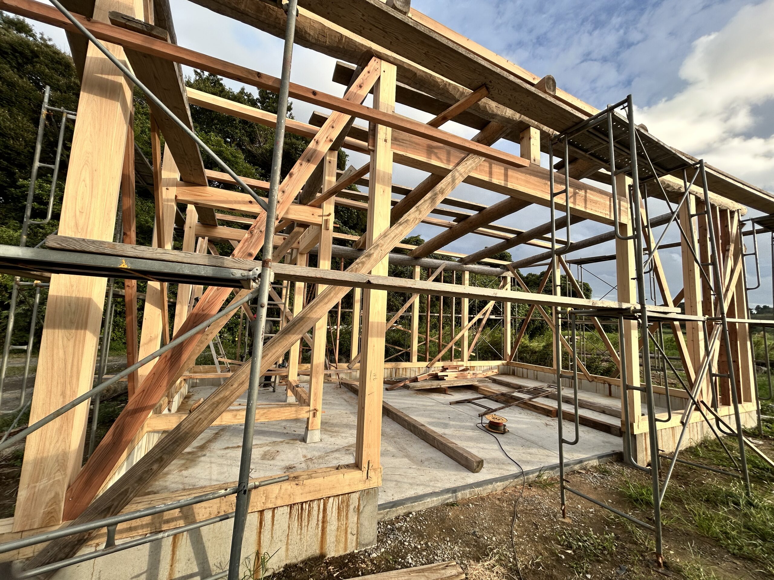 奥行きが5460ミリに対し、構造上、柱が屋内に無くても大丈夫な様に丸太梁を採用。